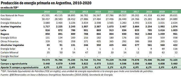 La producción primaria de energía consiste en la extracción o captación del recurso. En 2020, la producción primaria en Argentina totalizó 72.103.000 TEP (Tonelada de Petróleo Equivalente) según los últimos datos publicados por la Secretaría de Energía de la Nación. La agroindustria originó el 4,8% a esta producción a partir de cuatro fuentes: aceites vegetales (del crush de poroto de soja y semilla de girasol), leña, bagazo de caña de azúcar y alcoholes vegetales (de la industrialización de maíz y caña de azúcar). Así, la producción agoindustrial de energía primaria totalizó 3.460.000 TEP.