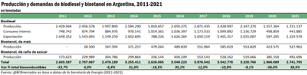 A la fecha, la Secretaría de Energía no ha publicado aún el Balance Energético consolidado para el año 2021. Sin embargo, sí ha publicado mensualmente la producción (en toneladas) de biodiesel en base a soja y bioetanol de maíz y caña de azúcar. Estos datos referentes a las dos mayores fuentes energéticas que surgen de la agroindustria resultan muy útiles ya que son representativos del sector.