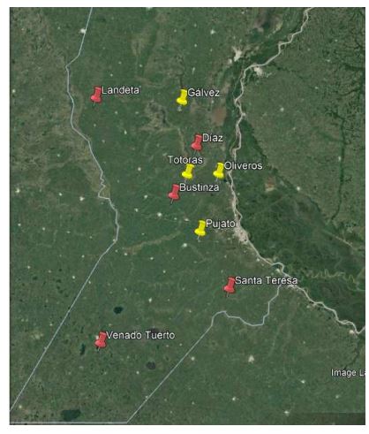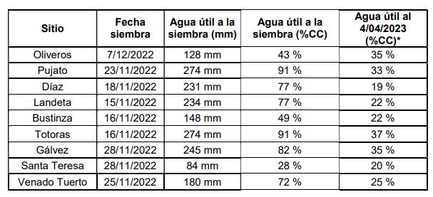 En el marco de la RED de variedades de soja en el sur de Santa Fe, se realizó el seguimiento del estado hídrico del cultivo. En todos los sitios se midió agua útil por el método gravimétrico previo a la siembra hasta 2m de profundidad. Posteriormente, mediante la utilización del software BAHICU (Balance hídrico de cultivo) se determinó el estado hídrico del cultivo para una fecha determinada. Se realiza un balance diario, tomando como partida el agua útil a la siembra, sumando las precipitaciones y restando la evapotranspiración del cultivo. Dado que este modelo contempla la exploración radicular, la evolución del estado hídrico de la soja no dependerá exclusivamente de las lluvias, sino también del agua almacenada en el suelo que es captada durante la exploración radicular. Ahí radica la importancia del muestreo de agua útil, que es saber con cuánta agua partimos para nuestra producción. Para los distintos sitios que participan en la Red (Tablas 1; Figura 1), se puede observar los mm de agua disponible a la siembra, cuanto representan los mismos en porcentaje de capacidad de campo (CC) y el valor de agua útil disponible al 4-04-2023. Las escasas precipitaciones en la región y el consumo de agua por parte de los cultivos explican la baja disponibilidad de agua a la fecha, todos los sitios tienen valores de agua por debajo del límite de estrés (50% CC), condición que reviste de gran importancia ya que las variedades de ciclo largo se encuentran en el periodo de llenado de grano (R6), mientras que las variedades de ciclo corto ya alcanzaron madurez fisiológica (R7).