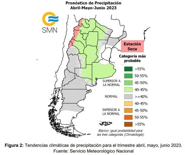 Figura N° 1: Ubicación de los sitios participantes de la Red de Soja. Referencia: Verde: > 60% Agua Útil; Amarillo: < 60% y >30 % y Rojo: < 30% de Agua Útil. Luego de analizar los valores de agua útil obtenidos es fundamental la ocurrencia de precipitaciones para poder acumular agua en el perfil hídrico para la campaña 23/24. Según las tendencias climáticas para el trimestre abril, mayo, junio emitido por Servicio Meteorológico Nacional, las precipitaciones para el oeste de la provincia serán normales o mayores a lo normal, mientras que hacia el este las tres categorías: normales, inferiores o superiores tienen la misma probabilidad de ocurrencia (Figura 2)