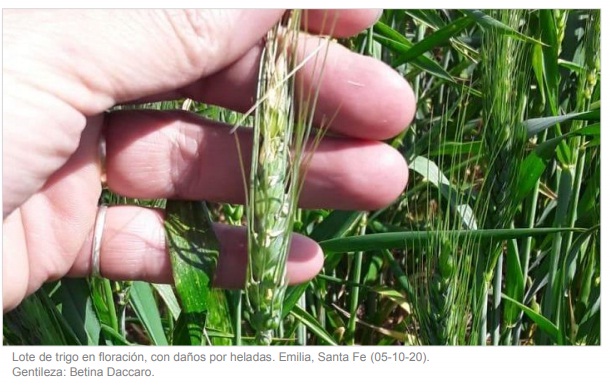 En las provincias de Córdoba, Santa Fe y Entre Ríos, y en los Núcleos Norte y Sur, el nivel de afectación debido a las heladas aumenta de este a oeste, en función de la humedad disponible en los cuadros. A su vez, el daño es mayor en los cuadros que ya transitan espigazón dada la sensibilidad de esta etapa a bajas temperaturas.