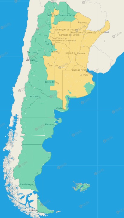 Buenos Aires: Campana – Exaltación de la Cruz – San Antonio de Areco – Zárate -Baradero – Ramallo – San Nicolás – San Pedro – Arrecifes – Capitán Sarmiento – Carmen de Areco – Chacabuco – Colón – General Arenales – General Pinto – Junín – Leandro N. Alem – Lincoln – Pergamino – Rojas – Salto – General Las Heras – General Rodríguez – Luján – Marcos Paz – Mercedes – San Andrés de Giles – Suipacha – General Alvear – General Belgrano – General Paz – Las Flores – Lobos – Monte – Navarro – Roque Pérez – Saladillo – Oeste de Castelli – Oeste de Chascomús – Oeste de Dolores – Oeste de General Lavalle – Oeste de Lezama – Oeste de Punta Indio – Oeste de Tordillo – Pila – Este de Castelli – Este de Chascomús – Este de Dolores – Este de Lezama – Este de Magdalena – Este de Punta Indio – Este de Tordillo – Este de General Lavalle – La Costa – Pinamar – Sudeste de General Juan Madariaga – Villa Gesell – Costa de General Pueyrredón – Costa de Mar Chiquita – General Alvarado – Azul – Rauch – Tapalqué – Zona baja de Benito Juárez – Zona baja de Tandil – Adolfo Gonzales Chaves – Centro de Lobería – Norte de Coronel Dorrego – Norte de Necochea – Norte de San Cayetano – Norte de Tres Arroyos – Alberti – Bragado – Chivilcoy – General Viamonte – Nueve de Julio – Veinticinco de Mayo – Bolívar – Carlos Casares – Carlos Tejedor – Hipólito Yrigoyen – Pehuajó – Florentino Ameghino – General Villegas – Rivadavia – Adolfo Alsina – Daireaux – Guaminí – Pellegrini – Salliqueló – Trenque Lauquen – Tres Lomas – Norte de Bahía Blanca – Oeste de Patagones – Oeste de Villarino – Puan – Zona baja de Coronel Pringles – Zona baja de Coronel Suárez – Zona baja de Saavedra – Zona baja de Tornquist -Costa de Lobería – Costa de Necochea – Costa de San Cayetano – Costa de Tres Arroyos – Esteban Echeverría – Ezeiza – La Matanza – Merlo – Almirante Brown – Avellaneda – Berazategui – Florencio Varela – Lanús – Lomas de Zamora – Presidente Perón – Quilmes – Escobar – San Fernando – San Isidro – Tigre – Vicente López