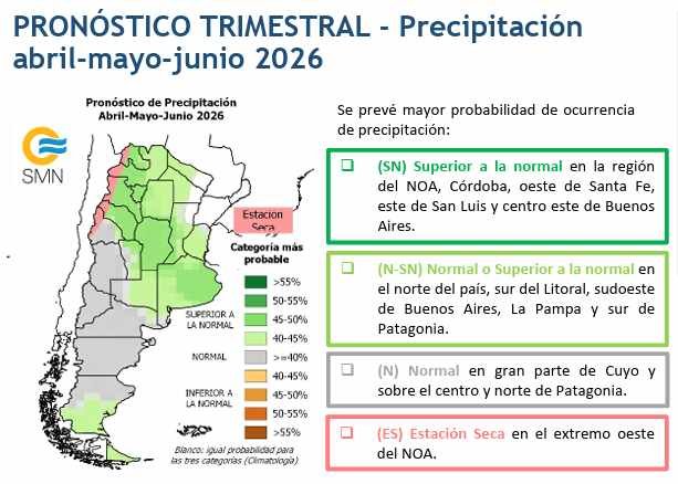 El Servicio Meteorológico Nacional anticipa un trimestre con precipitaciones por encima de lo normal en áreas clave del país, lo que enciende una señal de alerta para el sector agropecuario. El foco está en regiones que ya presentan excesos hídricos, donde nuevas lluvias podrían agravar el escenario.
