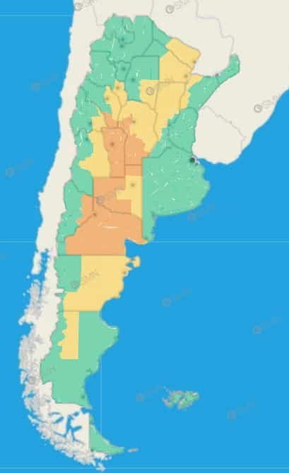 Las provincias alcanzadas por el alerta son Córdoba, La Pampa, La Rioja, Mendoza, Neuquén, Río Negro, San Juan, San Luis, Catamarca, Chaco, Chubut, Corrientes, Formosa, Santa Cruz, Santa Fe y Santiago del Estero.