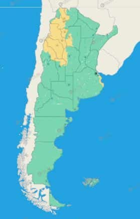 Tucumán: Burruyacú – Capital – Cruz Alta – Famaillá – Graneros – La Cocha – Leales – Simoca – Trancas – Yerba Buena – Zonas bajas de Chicligasta – Zonas bajas de Juan Bautista Alberdi – Zonas bajas de Lules – Zonas bajas de Monteros – Zonas bajas de Río Chico – Zonas bajas de Tafí Viejo – Zona montañosa de Andalgalá – Zona montañosa de Santa María – Zona montañosa de Chicligasta – Zona montañosa de Juan Bautista Alberdi – Zona montañosa de Lules – Zona montañosa de Monteros – Zona montañosa de Río Chico – Zona montañosa de Tafí Viejo – Zona montañosa de Tafí del Valle