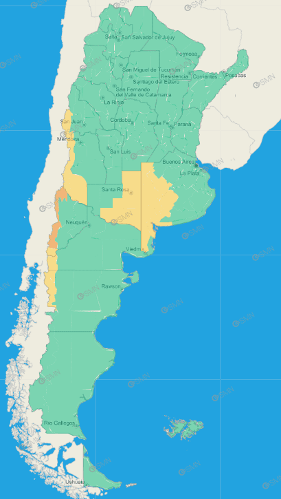 Buenos Aires: Norte de Bahía Blanca – Oeste de Patagones – Oeste de Villarino – Puan – Zona baja de Coronel Pringles – Zona baja de Coronel Suárez – Zona baja de Saavedra – Zona baja de Tornquist – Costa de Bahía Blanca – Costa de Coronel Dorrego – Costa de Coronel de Marina Leonardo Rosales – Costa de Villarino – Monte Hermoso –