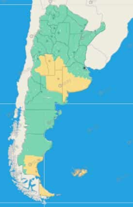 Buenos Aires: Este de General Lavalle – La Costa – Pinamar – Sudeste de General Juan Madariaga – Villa Gesell – Ayacucho – Balcarce – General Guido – Maipú – Noroeste de General Juan Madariaga – Noroeste de Mar Chiquita – Oeste de General Pueyrredón – Costa de General Pueyrredón – Costa de Mar Chiquita – General Alvarado – Zona serrana de Benito Juárez – Zona serrana de Loberia – Zona serrana de Necochea – Zona serrana de Tandil – Azul – Rauch – Tapalqué – Zona baja de Benito Juárez – Zona baja de Tandil – Costa de Lobería – Costa de Necochea – Costa de San Cayetano – Costa de Tres Arroyos – Adolfo Gonzales Chaves – Centro de Lobería – Norte de Coronel Dorrego – Norte de Necochea – Norte de San Cayetano – Norte de Tres Arroyos – General La Madrid – Laprida – Olavarría -Norte de Bahía Blanca – Oeste de Patagones – Oeste de Villarino – Puan – Zona baja de Coronel Pringles – Zona baja de Coronel Suárez – Zona baja de Saavedra – Zona baja de Tornquist – Adolfo Alsina – Daireaux – Guaminí – Pellegrini – Salliqueló – Trenque Lauquen – Tres Lomas – Florentino Ameghino – General Villegas – Rivadavia – Bolívar – Carlos Casares – Carlos Tejedor – Hipólito Yrigoyen – Pehuajó