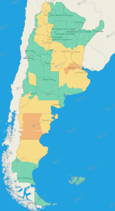 Buenos Aires: Costa de General Pueyrredón – Costa de Mar Chiquita – General Alvarado – Zona serrana de Benito Juárez – Zona serrana de Lobería – Zona serrana de Necochea – Zona serrana de Tandil – Azul – Rauch – Tapalqué – Zona baja de Benito Juárez – Zona baja de Tandil – Ayacucho – Balcarce – General Guido – Maipú – Noroeste de General Juan Madariaga – Noroeste de Mar Chiquita – Oeste de General Pueyrredón – Pinamar – Sudeste de General Juan Madariaga – Villa Gesell – Este de General Lavalle – La Costa – Este de Castelli – Este de Chascomús – Este de Dolores – Este de Lezama – Este de Magdalena – Este de Punta Indio – Este de Tordillo – Oeste de Castelli – Oeste de Chascomús – Oeste de Dolores – Oeste de General Lavalle – Oeste de Lezama – Oeste de Punta Indio – Oeste de Tordillo – Pila – General La Madrid – Laprida – Olavarría – General Alvear – General Belgrano – General Paz – Las Flores – Lobos – Monte – Navarro – Roque Pérez – Saladillo – Adolfo Alsina – Daireaux – Guaminí – Pellegrini – Salliqueló – Trenque Lauquen – Tres Lomas – Bolívar – Carlos Casares – Carlos Tejedor – Hipólito Yrigoyen – Pehuajó – Berisso – Ensenada – La Plata – Almirante Brown – Avellaneda – Berazategui – Florencio Varela – Lanús – Lomas de Zamora – Presidente Perón – Quilmes – Esteban Echeverría – Ezeiza – La Matanza – Merlo – Escobar – San Fernando – San Isidro – Tigre – Vicente López – Florentino Ameghino – General Villegas – Rivadavia