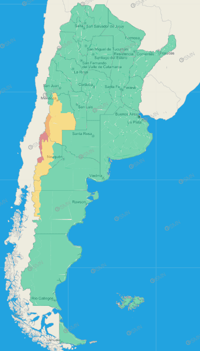 Neuquén: Este de Loncopué – Este de Picunches – Este de Ñorquín – Oeste de Añelo – Oeste de Pehuenches – Sur de Chos Malal – Sur de Minas – Catán Lil – Collón Curá – Zapala – Zona baja de Aluminé – Zona baja de Huiliches – Zona baja de Lácar – Cordillera de Huiliches – Cordillera de Lácar – Sur de Aluminé – Los Lagos