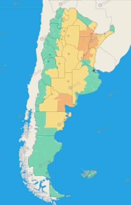 Tucumán: Burruyacú – Capital – Cruz Alta – Famaillá – Graneros – La Cocha – Leales – Simoca – Trancas – Yerba Buena – Zonas bajas de Chicligasta – Zonas bajas de Juan Bautista Alberdi – Zonas bajas de Lules – Zonas bajas de Monteros – Zonas bajas de Río Chico – Zonas bajas de Tafí Viejo – Zona montañosa de Andalgalá – Zona montañosa de Santa María – Zona montañosa de Chicligasta – Zona montañosa de Juan Bautista Alberdi – Zona montañosa de Lules – Zona montañosa de Monteros – Zona montañosa de Río Chico – Zona montañosa de Tafí Viejo – Zona montañosa de Tafí del Valle