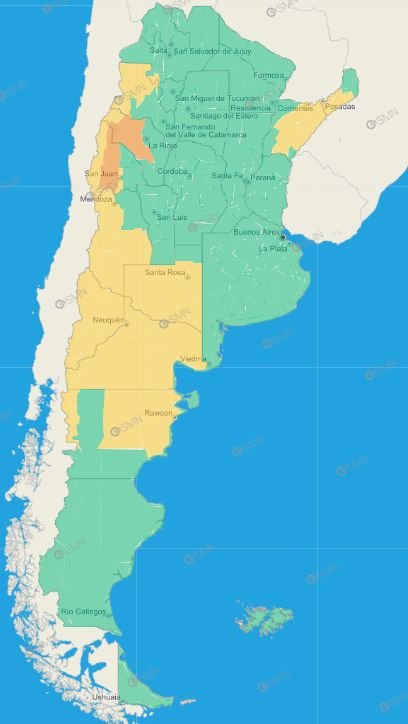Mendoza: General Alvear – Zona baja de San Rafael – Zona baja de Malargüe – Cordillera de Las Heras – Cordillera de Luján de Cuyo – Cordillera de Tupungato – Cordillera de Malargüe – Cordillera de San Rafael – Zona baja de Malargüe