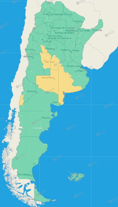 Buenos Aires: Costa de Patagones – Norte de Bahía Blanca – Oeste de Patagones – Oeste de Villarino – Puan – Zona baja de Coronel Pringles – Zona baja de Coronel Suárez – Zona baja de Saavedra – Zona baja de Tornquist – Costa de Bahía Blanca – Costa de Coronel Dorrego – Costa de Coronel de Marina Leonardo Rosales – Costa de Villarino – Monte Hermoso – Adolfo Gonzales Chaves – Centro de Lobería – Norte de Coronel Dorrego – Norte de Necochea – Norte de San Cayetano – Norte de Tres Arroyos – Costa de Lobería – Costa de Necochea – Costa de San Cayetano – Costa de Tres Arroyos – Adolfo Alsina – Daireaux – Guaminí – Pellegrini – Salliqueló – Trenque Lauquen – Tres Lomas – General La Madrid – Laprida – Olavarría – Bolívar – Carlos Casares – Carlos Tejedor – Hipólito Yrigoyen – Pehuajó – Florentino Ameghino – General Villegas – Rivadavia