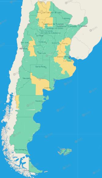 Buenos Aires: Este de Castelli – Este de Chascomús – Este de Dolores – Este de Lezama – Este de Magdalena – Este de Punta Indio – Este de Tordillo – Oeste de Castelli – Oeste de Chascomús – Oeste de Dolores – Oeste de General Lavalle – Oeste de Lezama – Oeste de Punta Indio – Oeste de Tordillo – Pila – Este de General Lavalle – La Costa – Pinamar – Sudeste de General Juan Madariaga – Villa Gesell – Costa de General Pueyrredón – Costa de Mar Chiquita – General Alvarado – Costa de General Pueyrredón – Costa de Mar Chiquita – General Alvarado – Ayacucho – Balcarce – General Guido – Maipú – Noroeste de General Juan Madariaga – Noroeste de Mar Chiquita – Oeste de General Pueyrredón – Azul – Rauch – Tapalqué – Zona baja de Benito Juárez – Zona baja de Tandil – General Alvear – General Belgrano – General Paz – Las Flores – Lobos – Monte – Navarro – Roque Pérez – Saladillo Alberti – Bragado – Chivilcoy – General Viamonte – Nueve de Julio – Veinticinco de Mayo Baradero – Ramallo – San Nicolás – San Pedro