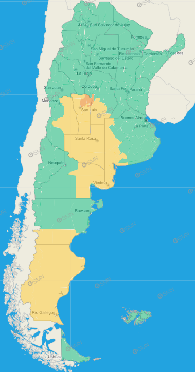 Buenos Aires: Norte de Bahía Blanca – Oeste de Patagones – Oeste de Villarino – Puan – Zona baja de Coronel Pringles – Zona baja de Coronel Suárez – Zona baja de Saavedra – Zona baja de Tornquist – Costa de Bahía Blanca – Costa de Coronel Dorrego – Costa de Coronel de Marina Leonardo Rosales – Costa de Villarino – Monte Hermoso – Costa de Patagones – Adolfo Alsina – Daireaux – Guaminí – Pellegrini – Salliqueló – Trenque Lauquen – Tres Lomas – Florentino Ameghino – General Villegas – Rivadavia