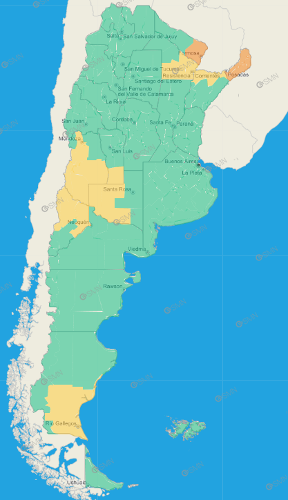 Santa Cruz: Meseta de Corpen Aike – Meseta de Güer Aike – Meseta de Lago Argentino – Costa de Corpen Aike – Costa de Güer Aike (El área será afectada por vientos del sector oeste con velocidades entre 50 y 70 km/h, con ráfagas que pueden alcanzar los 100 km/h.)