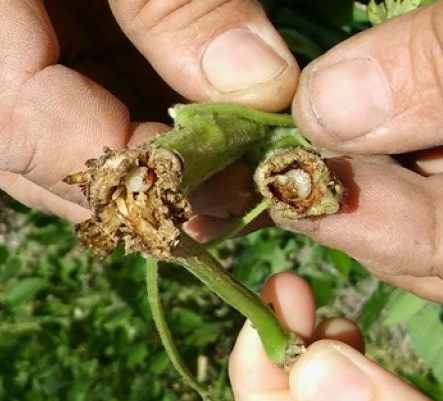 -Adultos: Atacan el tallo principal, deshilachando los tejidos exteriores. También generan un anillado característico en el cual la hembra coloca los huevos formando una agalla (ensanchamiento anormal en el tallo).