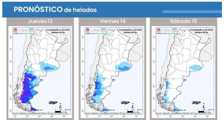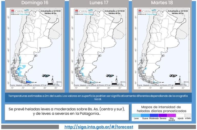 Según el nuevo pronóstico de heladas del Instituto de Clima y Agua, se prevén heladas leves a moderadas sobre el centro y sur de Buenos Aires y de leves a severas en la Patagonia. “Una nueva entrada de aire frío generará descenso de las temperaturas y dará condiciones para la posible ocurrencia de heladas de leves a moderadas sobre el centro-este y sur de la región Pampeana y Patagonia. La mayor probabilidad de ocurrencia de este fenómeno se prevé para el viernes”, remarcó Gattinoni.