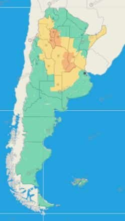 La Rioja: General Juan Facundo Quiroga – General San Martín – Rosario Vera Peñaloza -Chamical – General Belgrano – General Ocampo – Arauco – Capital – Castro Barros – Sanagasta – Chilecito – Famatina – General Ángel Vicente Peñaloza – Independencia – San Blas de los Sauces – Zona baja de Coronel Felipe Varela – Zona baja de General Lamadrid – Zona baja de Vinchina