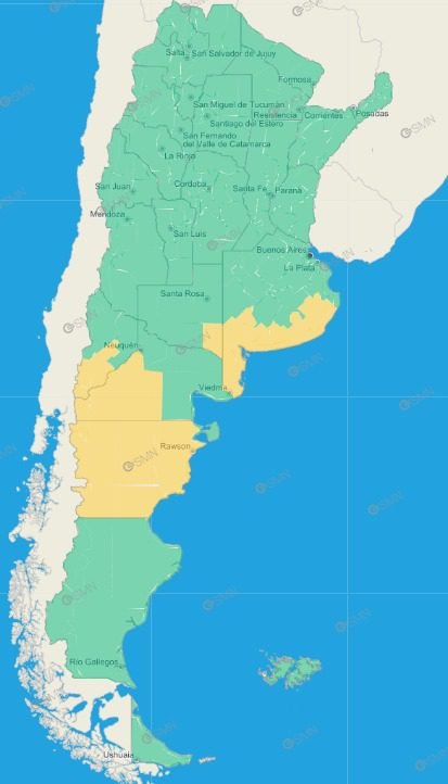 Buenos Aires: Costa de Patagones – Costa de Bahía Blanca – Costa de Coronel Dorrego – Costa de Coronel de Marina Leonardo Rosales – Costa de Villarino – Monte Hermoso – Norte de Bahía Blanca – Oeste de Patagones – Oeste de Villarino – Puan – Zona baja de Coronel Pringles – Zona baja de Coronel Suárez – Zona baja de Saavedra – Zona baja de Tornquist – Adolfo Gonzales Chaves – Centro de Lobería – Norte de Coronel Dorrego – Norte de Necochea – Norte de San Cayetano – Norte de Tres Arroyos – Costa de Lobería – Costa de Necochea – Costa de San Cayetano – Costa de Tres Arroyos – Costa de General Pueyrredón – Costa de Mar Chiquita – General Alvarado – Ayacucho – Balcarce – General Guido – Maipú – Noroeste de General Juan Madariaga – Noroeste de Mar Chiquita – Oeste de General Pueyrredón – Pinamar – Sudeste de General Juan Madariaga – Villa Gesell