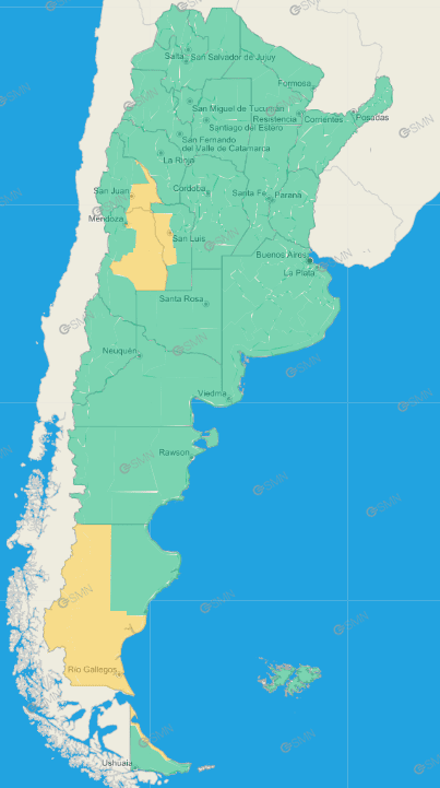 Santa Cruz: Meseta de Lago Buenos Aires – Meseta de Río Chico – Costa de Magallanes – Costa de Corpen Aike – Meseta de Corpen Aike – Meseta de Güer Aike – Meseta de Lago Argentino – Costa de Güer Aike – Cordillera de Güer Aike – Cordillera de Lago Argentino – Cordillera de Lago Buenos Aires – Cordillera de Río Chico