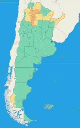 Tucumán: Burruyacú – Capital – Cruz Alta – Famaillá – Graneros – La Cocha – Leales – Simoca – Trancas – Yerba Buena – Zonas bajas de Chicligasta – Zonas bajas de Juan Bautista Alberdi – Zonas bajas de Lules – Zonas bajas de Monteros – Zonas bajas de Río Chico – Zonas bajas de Tafí Viejo – Zona montañosa de Chicligasta – Zona montañosa de Juan Bautista Alberdi – Zona montañosa de Lules – Zona montañosa de Monteros – Zona montañosa de Río Chico – Zona montañosa de Tafí Viejo – Zona montañosa de Tafí del Valle – Zona montañosa de Andalgalá – Zona montañosa de Santa María – Valles de Santa María – Valles de Tafí del Valle