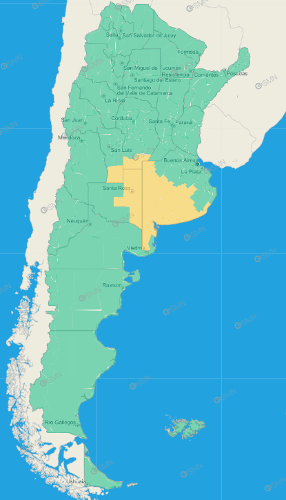 Buenos Aires: Costa de General Pueyrredón – Costa de Mar Chiquita – General Alvarado – Costa de Lobería – Costa de Necochea – Costa de San Cayetano – Costa de Tres Arroyos – Adolfo Gonzales Chaves – Centro de Lobería – Norte de Coronel Dorrego – Norte de Necochea – Norte de San Cayetano – Norte de Tres Arroyos – Costa de Bahía Blanca – Costa de Coronel Dorrego – Costa de Coronel de Marina Leonardo Rosales – Costa de Villarino – Monte Hermoso – Norte de Bahía Blanca – Oeste de Patagones – Oeste de Villarino – Puan – Zona baja de Coronel Pringles – Zona baja de Coronel Suárez – Zona baja de Saavedra – Zona baja de Tornquist – Zona serrana de Benito Juárez – Zona serrana de Lobería – Zona serrana de Necochea – Zona serrana de Tandil – Azul – Rauch – Tapalqué – Zona baja de Benito Juárez – Zona baja de Tandil – Adolfo Alsina – Daireaux – Guaminí – Pellegrini – Salliqueló – Trenque Lauquen – Tres Lomas – General La Madrid – Laprida – Olavarría