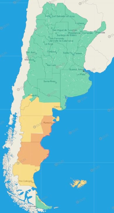 Santa Cruz: Meseta de Deseado – Meseta de Magallanes – Meseta de Lago Buenos Aires – Meseta de Río Chico – Cordillera de Lago Buenos Aires – Cordillera de Río Chico – Meseta de Corpen Aike – Meseta de Güer Aike – Meseta de Lago Argentino – Cordillera de Güer Aike – Cordillera de Lago Argentino – Costa de Güer Aike