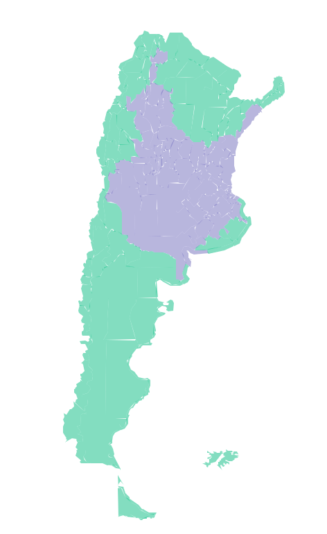 Buenos Aires: Costa de Bahía Blanca – Costa de Coronel Dorrego – Costa de Coronel de Marina Leonardo Rosales – Costa de Villarino – Monte Hermoso – Norte de Bahía Blanca – Oeste de Patagones – Oeste de Villarino – Puan – Zona baja de Coronel Pringles – Zona baja de Coronel Suárez – Zona baja de Saavedra – Zona baja de Tornquist – Adolfo Alsina – Daireaux – Guaminí – Pellegrini – Salliqueló – Trenque Lauquen – Tres Lomas – Azul – Rauch – Tapalqué – Zona baja de Benito Juárez – Zona baja de Tandil – General Alvear – General Belgrano – General Paz – Las Flores – Lobos – Monte – Navarro – Roque Pérez – Saladillo – Brandsen – Cañuelas – Oeste de Magdalena – San Vicente – Campana – Exaltación de la Cruz – San Antonio de Areco – Zárate – Baradero – Ramallo – San Nicolás – San Pedro – Arrecifes – Capitán Sarmiento – Carmen de Areco – Chacabuco – Colón – General Arenales – General Pinto – Junín – Leandro N. Alem – Lincoln – Pergamino – Rojas – Salto – Florentino Ameghino – General Villegas – Rivadavia – Bolívar – Carlos Casares – Carlos Tejedor – Hipólito Yrigoyen – Pehuajó – Alberti – Bragado – Chivilcoy – General Viamonte – Nueve de Julio – Veinticinco de Mayo – Florentino Ameghino – General Villegas – Rivadavia – General Las Heras – General Rodríguez – Luján – Marcos Paz – Mercedes – San Andrés de Giles – Suipacha