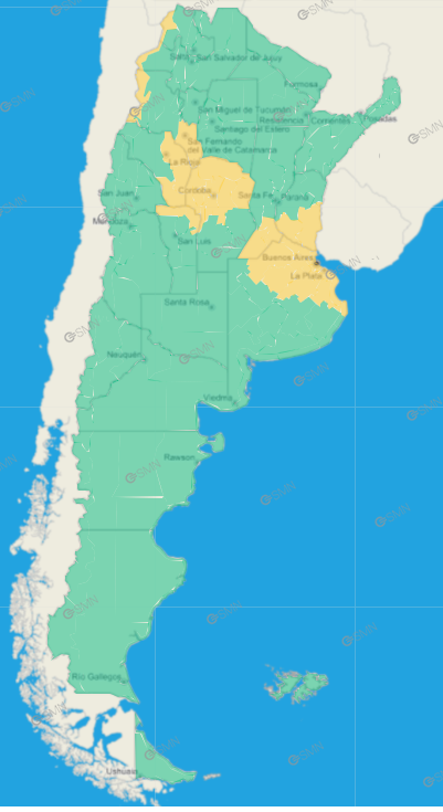 Córdoba: Zona baja de Calamuchita – Zona baja de Santa María – Río Primero – Río Segundo – Tercero Arriba – San Justo – Oeste de Pocho – Oeste de San Alberto – Oeste de San Javier – Zona baja de Cruz del Eje – Zona baja de Minas – Zona serrana de Cruz del Eje – Zona serrana de Minas – Zona serrana de Pocho – Zona serrana de San Alberto – Zona serrana de San Javier – Ischilín – Río Seco – Sobremonte – Tulumba – Zona baja de Colón – Zona baja de Totoral