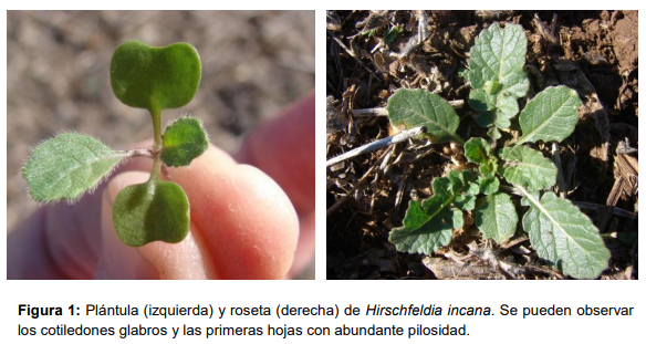 Hirschfeldia incana es una especie de la familia de las crucíferas, de ciclo anual o bienal. Nace principalmente en otoño – invierno, comportándose como maleza en cultivos invernales y aún de verano por su largo ciclo. Al inicio forma una roseta, densamente pubescente y áspera al tacto (Figura 1). Para una descripción más detallada de la especie ver Ustarroz (2017).