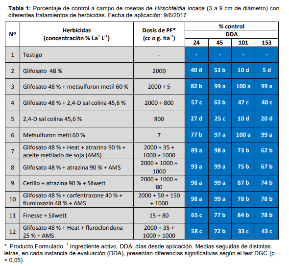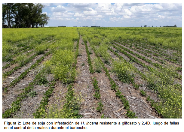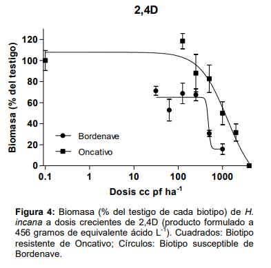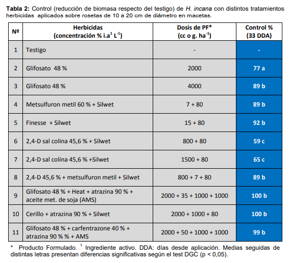 - El biotipo “Oncativo” de H. incana es resistente a glifosato y 2,4D. Sin embargo, el grado de resistencia es bajo por lo que el agregado de glifosato y 2,4D a otros herbicidas puede mejorar su control.