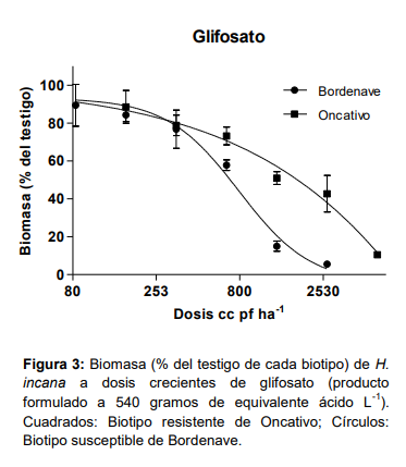En lotes cercanos a la localidad de Oncativo, destinados principalmente a la siembra de soja y maíz, se han observado desde el año 2016 fallas de control de esta especie a aplicaciones de glifosato + 2,4D realizadas durante el barbecho (Figura 2). Teniendo en cuenta esta situación, el equipo de Disherbología de la E.E.A de INTA Manfredi realizó ensayos a campo y en condiciones controladas para confirmar la resistencia y evaluar alternativas de control químico de este biotipo, denominado “Oncativo” (Ustarroz, 2017, 2018). Luego de las evaluaciones, se confirmó su resistencia a glifosato y 2,4 D. Sin embargo, ésta no fue elevada, requiriéndose para un 50% de reducción de biomasa 2,5 veces más dosis de ambos herbicidas que en un biotipo susceptible proveniente de Bordenave (Figuras 3 y 4).