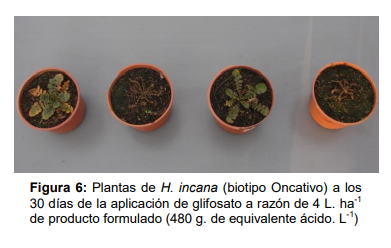 En otro ensayo realizado durante 2017 pero en macetas, el biotipo Oncativo también presentó baja susceptibilidad a 2,4D (Tabla 2). Con glifosato se lograron mayores niveles de control que en la experiencia a campo (Tabla 1 y 2), pero se observó una gran variabilidad en la susceptibilidad de las plantas, sobreviviendo algunas a una doble dosis del herbicida (Figura 6). Con el resto de los tratamientos evaluados se obtuvo buen control.