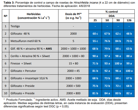 Durante el 2018 se realizó otro ensayo a campo. En la Tabla 3 se presentan los tratamientos y el porcentaje de control registrado en observaciones posteriores a su aplicación. Los tratamientos que se destacaron fueron el 5, 6 y 7. La mezcla de glifosato + atrazina, que tuvo buen control en el 2017 (Tabla 1), sólo produjo un control postemergente parcial con posterior rebrote desde el ápice. Esto podría deberse a que la maleza presentaba un mayor tamaño en relación al ensayo realizado en 2017. Sin embargo, con glifosato se observó un efecto inverso, obteniéndose mayor control de la maleza que en el 2017. Metsulfurón metil fue menos eficaz que en el 2017, lo que podría deberse a que en el primer año la dosis de 5 g ha-1 se aplicó en mezcla con glifosato. El tratamiento 10 tuvo un control aceptable, no obstante, es necesario evaluarlo nuevamente ya que se observó rebrote de la maleza.