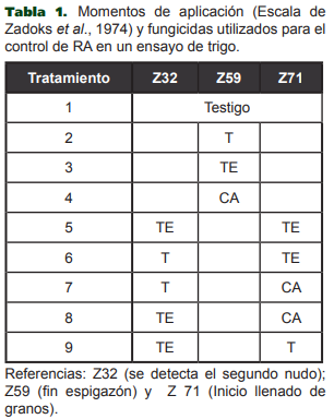Se usó una variedad muy susceptible a RA y moderadamente susceptible RH y MA que tiene una amplia difusión en la zona (DM Algarrobo). Los fungicidas utilizados estaban formulados en base a fluxapyroxad 5% + epoxyconazole 5% + pyraclostrobin 8,1% (CA), Ciproconazol 8% + Azoxistrobin 20% (TE) y Tebuconazole 43 % (T). Los tratamientos se describen en la Tabla 1.