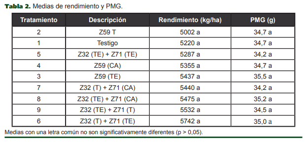 No se encontraron diferencias estadísticas significativas para el rendimiento y el PMG entre los distintos tratamientos. En la Tabla 2 se presentan las medias de Rendimiento y PMG