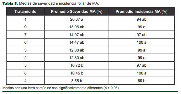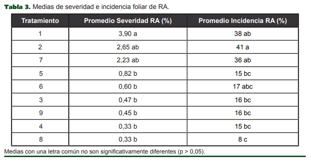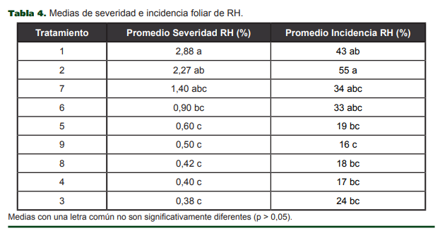 Las aplicaciones se realizaron con una mochila experimental de gas carbónico cuya barra tiene 5 pastillas de cono hueco tipo 80 015 distanciadas a 0,35 m entre sí. La presión de trabajo fue de 3 bar y el volumen erogado fue de 130 L/ha. Para el fungicida CA se usó una dosis de 1200 cm3 /ha, en TE 400 cm3 /ha y en T fue de 450 cm3 /ha. En ambos se agregó un coadyuvante siliconado a razón de 200 cm3 /ha. Para evaluar el control de RA y RH se estimó la severidad sobre 8 plantas por parcela utilizando la escala porcentual de Cobb modificada por Peterson et al., (1948) sobre las tres hojas superiores en el estadio de inicios de llenados de granos (Z 71) (datos no presentados) y sobre las dos hojas superiores en madurez pastosa (Z 85); mientras que para el caso de MA se utilizó la escala diagramática para bruzone de arroz (Siqueira de Azevedo, 1998) en los mismos estadios fenológicos. A partir de estos datos se calculó la severidad promedio e incidencia foliar promedio de cada tratamiento. La cosecha se realizó con una cosechadora autopropulsada de parcelas dentro de los cinco surcos centrales. Sobre una muestra del grano cosechado se determinó el peso de mil granos (PMG). Se realizó un análisis de la varianza para un DBCA y se compararon las medias con el test LSD al 0,05.