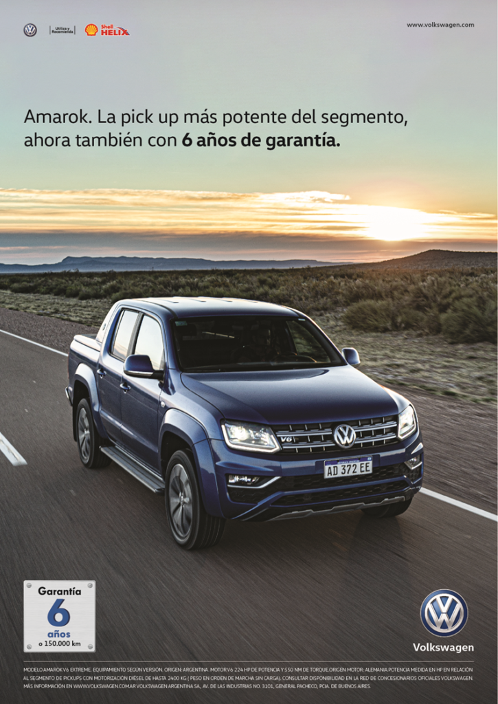 Volkswagen Argentina anuncia la ampliación de la garantía para Amarok, la pick up que se fabrica en General Pacheco y se exporta a más de 30 países de todo el mundo. Con una cobertura de 6 años o 150.000 km (lo que ocurra primero) para todas sus versiones, Amarok, la pick up más potente del segmento, ofrece ahora también la garantía más amplia del mercado.