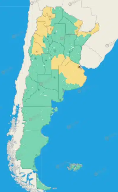 Buenos Aires: Berisso – Ensenada – La Plata – Almirante Brown – Avellaneda – Berazategui – Florencio Varela – Lanús – Lomas de Zamora – Presidente Perón – Quilmes – Escobar – San Fernando – San Isidro – Tigre – Vicente López – Campana – Exaltación de la Cruz – San Antonio de Areco – Zárate – Arrecifes – Capitán Sarmiento – Carmen de Areco – Chacabuco – Colón – General Arenales – General Pinto – Junín – Leandro N. Alem – Lincoln – Pergamino – Rojas – Salto – Florentino Ameghino – General Villegas – Rivadavia – Bolívar – Carlos Casares – Carlos Tejedor – Hipólito Yrigoyen – Pehuajó -Alberti – Bragado – Chivilcoy – General Viamonte – Nueve de Julio – Veinticinco de Mayo – General Las Heras – General Rodríguez – Luján – Marcos Paz – Mercedes – San Andrés de Giles – Suipacha – Brandsen – Cañuelas – Oeste de Magdalena – San Vicente – General Alvear – General Belgrano – General Paz – Las Flores – Lobos – Monte – Navarro – Roque Pérez – Saladillo – Brandsen – Cañuelas – Oeste de Magdalena – San Vicente – Azul – Rauch – Tapalqué – Zona baja de Benito Juárez – Zona baja de Tandil – Este de Castelli – Este de Chascomús – Este de Dolores – Este de Lezama – Este de Magdalena – Este de Punta Indio – Este de Tordillo – Oeste de Castelli – Oeste de Chascomús – Oeste de Dolores – Oeste de General Lavalle – Oeste de Lezama – Oeste de Punta Indio – Oeste de Tordillo – Pila – Pinamar – Sudeste de General Juan Madariaga – Villa Gesell – Este de General Lavalle – La Costa – Costa de General Pueyrredón – Costa de Mar Chiquita – General Alvarado – Zona serrana de Benito Juárez – Zona serrana de Loberia – Zona serrana de Necochea – Zona serrana de Tandil