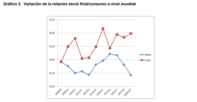 Se observa un importante crecimiento de los stocks hasta la campaña 2016/17. A partir de ese ciclo los stocks finales de maíz decrecen en 2017/18 y lo hacen mas también en la proyección del nuevo ciclo. Esto se debe a que, aunque sube la producción esperada en 28 mill t lo hace en mayor medida el consumo (30,2 mill t), tanto por el uso forrajero como de biocombustible. En el caso de soja se mantiene la situación de aumento de stocks con lo que se da un panorama mas estable a positivo en maíz y con perspectiva bajista en soja. El efecto sobre los precios se da en la relación porcentual stock final /consumo que se muestra en el gráfico 2.