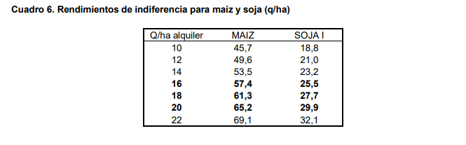 Considerando que actualmente se mantiene valores de alquiler cercanos a 18 q de soja /ha para zonas de buena aptitud agrícola surge que los rindes de indiferencia son 63 % de la productividad media en maíz y 72 % en soja de primera (con rendimientos respectivos de 91 q /ha en maíz y 35 q/ha en soja de primera en departamento Marcos Juárez). Cabe aclarar que, respecto al ciclo anterior, en maíz los rindes de indiferencia mencionados son 10,6% menores a los del ciclo pasado y en soja un 4,1% inferiores. Esto indica la mejora actual y la importancia de un buen nivel tecnológico para lograr productividad y el uso de instrumentos de cobertura (seguros y uso de mercados de futuro) para disminuir el riesgo en este tipo de contratos.