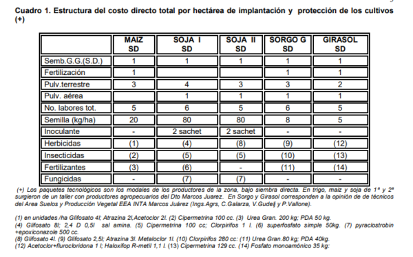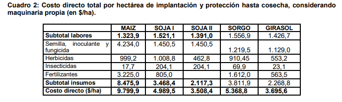 En base a la mencionada información se elaboraron los costos directos por hectárea y por cultivo (Cuadro 2). Para ello se utilizaron los costos de labores con maquinaria propia y los precios de insumos vigentes en agosto del corriente año (Márgenes Agropecuarios, 2018).