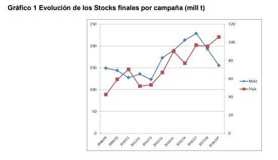 De este modo en el gráfico 1 se muestra la evolución de los stocks finales en millones de toneladas, (mill t) a nivel mundial de estos dos granos en las últimas campañas y las primeras proyecciones para el nuevo ciclo (USDA, 2018)