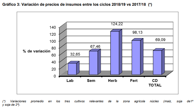 En el gráfico 3 se muestra la variación promedio que tiene cada rubro del costo operativo de los principales cultivos del cuadro 2 (promedio de maíz, soja de 1ª y soja de 2ª para el ciclo 2018/19 respecto al anterior período 2017/18).