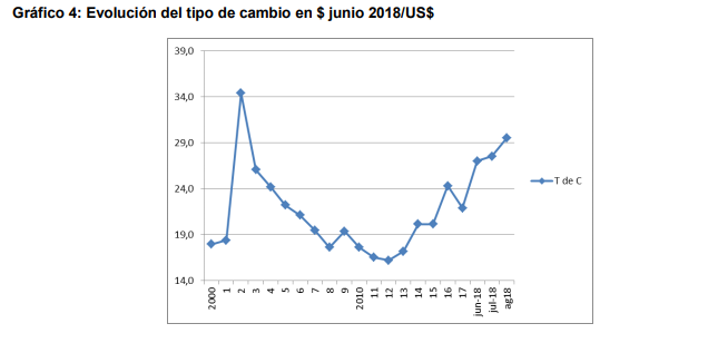 Teniendo en cuenta que la variación estimada de precios mayoristas en el período Agosto ’17 a Julio ‘18 (medida por el IPIM) fue de 44,1 % surge un aumento, en el promedio, del 25 %, del costo directo en términos reales. Se observa un encarecimiento, principalmente en ítems tecnológicos como herbicidas, fertilizantes y semillas debido a su relación directa con las variaciones del tipo de cambio mientras que, la suba del componente labores fue menor por el componente de costos internos (salarios y maquinarias respecto al ítem combustibles). Con fines ilustrativos en el gráfico 4 se muestra la evolución del tipo de cambio desde el año 2000, los últimos tres datos son mensuales para indicar la importante variación del mismo.