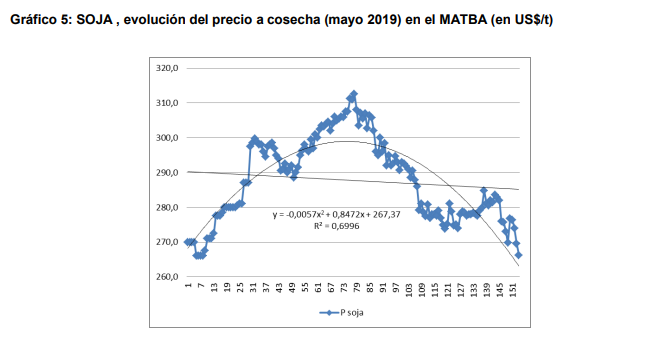 Este marcado efecto del tipo de cambio se muestra, a nivel local, en los precios de los granos expresados en moneda doméstica. En el gráfico 5 se presenta la evolución del valor esperado a cosecha en mayo 2019 para soja, posición que cotiza desde enero de 2018 en el MATBA (MATBA, 2018)