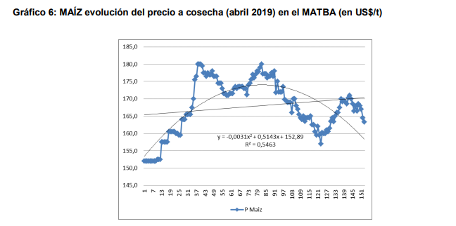 Se observa un comportamiento levemente decreciente en el conjunto que se muestra en la curva del ajuste cuadrático. En la primera parte la suba se debe al efecto sequía del verano en Argentina que produjo la tendencia creciente en el precio en Chicago. Luego, por la producción record de Brasil y las favorables perspectivas de la campaña en el hemisferio norte el precio tendió a la baja hasta la actualidad llegando a valores cercanos al promedio histórico. En el gráfico 6 se muestra la evolución del precio esperado de maíz a cosecha (abril 2019).