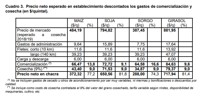 En maíz también se muestra un comportamiento similar en la primera parte y luego, la baja se interrumpe porque, a pesar que se espera buena oferta en la campaña del hemisferio norte, la situación mantiene stocks finales mas bajos y una fuerte demanda para el uso de maíz. En el cuadro 3 se muestran los precios esperados a cosecha para la campaña 2018/19 en pesos, considerando un tipo de cambio expresado en $ /US$, de 28,7 (promedio de agosto 2018 del Banco Nación). En maíz se consideró un valor de 168,01 US$ /t, en soja de 276,56 US$ /t. en girasol 307,3 US$/t y sorgo granífero 135 US$/t se hizo la proyección en base a la relación de precio actual ya que no tienen valores esperados a cosecha. Descontando los componentes de los costos de comercialización y cosecha, se detallan los precios netos esperados en establecimiento para la nueva campaña.