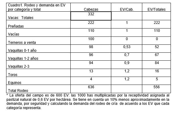 Para mantener un nivel eficiente de producción, es necesario manejar el rodeo tratando de conservar una carga animal adecuada a la receptividad de los campos. Campos en los cuales se necesita, más de una hectárea y media para mantener una vaca de cría, que no pierda peso, que conserve una condición corporal suficiente para entrar en servicio con celos fértiles al momento del entore y acercarse al objetivo final de la cría que es obtener un ternero por vaca y por año.