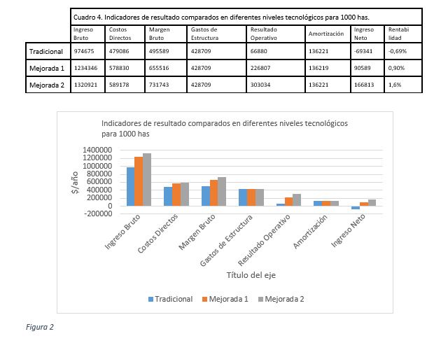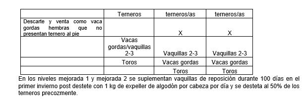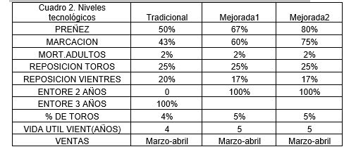 Los niveles tecnológicos a implementarse sobre este sistema se describen en el cuadro 2, en sus indicadores productivos y reproductivos, determinando al mismo tiempo posibles escenarios al sistema de producción actual, denominado ‘tradicional’ y futuros de ingresos y resultados económicos.